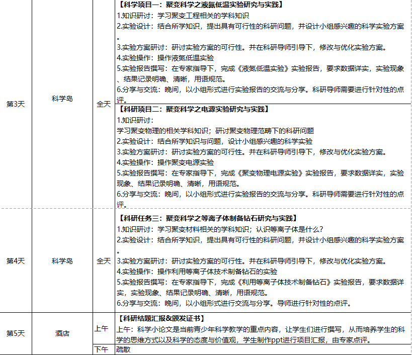 走進科學島,一次性接觸六大國家頂尖科學成果;特邀國家大科學裝置科學家全程帶領學生完成三大科研實驗,撰寫專業實驗報告;分享青年科學家科研道路選擇與規劃,感受榜樣力量;全面了解人造太陽研究的意義和價值,思考“人類終級能源”的意義;掌握文獻研究的方法,完成科學實踐調研報告;走進國家重點實驗室,掌握科研規范,深度參與實驗設計,完成相關科研實驗。