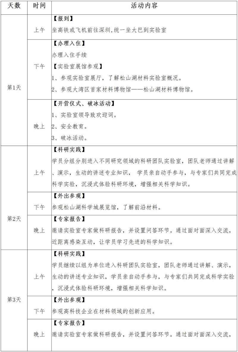 在專家的帶領下深入國家級重點實驗室——松山湖材料實驗室,和科研人員一起探究金屬、陶瓷、半導體、能源、生物以及新型復合材料等在生活和生產中的應用,激發學生對材料科學的探索興趣;將講座、實驗、參觀學習相結合,引導學生與專家、學者互動交流,共同探究材料領域熱點問題及未來發展方向,激發青少年形成科學志趣,養成科學思維,樹立科學志向;到實驗室進行材料科學實驗,沉浸式感受科研團隊氛圍,領略科研工作的樂趣,并在專家的指導下完成項目答辯,獲得營員證書。