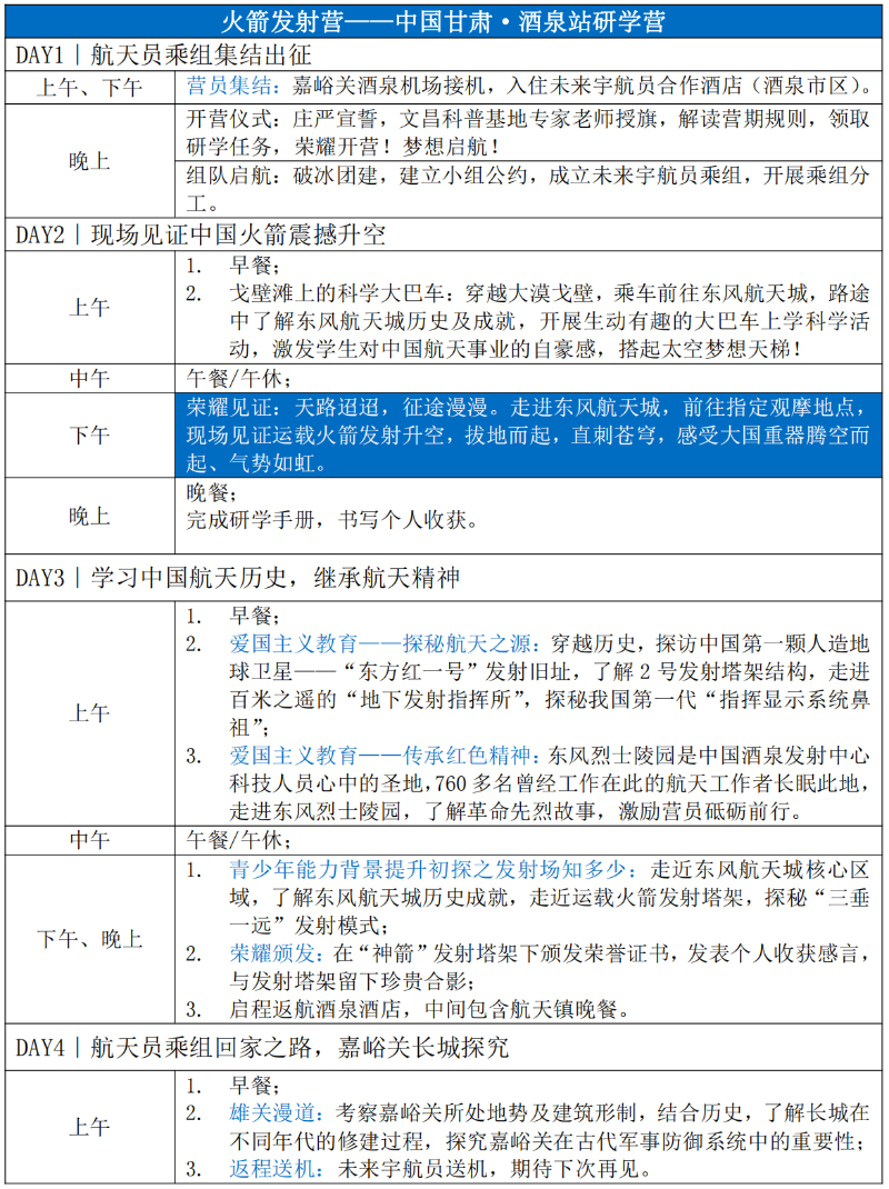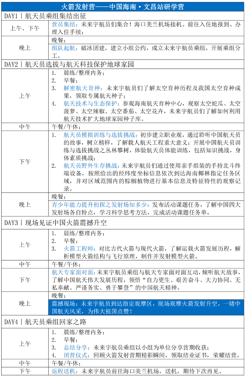 “未來宇航員”是航天文昌科普基地與中科天盛衛星技術服務有限公司共同打造的航天科普研學品牌。品牌系列活動貫穿全年,深度聚焦文昌、酒泉、北京三大航天基地研學產品與服務。