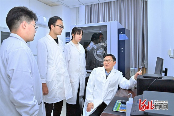 2022年11月30日,張福成教授(右一)指導團隊青年教師和博士生開展科研工作。華北理工大學供圖