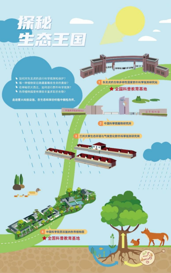 本期推出“探秘生態王國”主題探索路線,帶你走進北京師范大學東北虎豹生物多樣性國家野外科學觀測研究站、中國科學院植物研究所、蘭州大學生態環境與氣候變化野外科學觀測研究網和中國科學院西雙版納熱帶植物園,遨游在自然生態的畫卷里,感受科技帶來的生態之美。