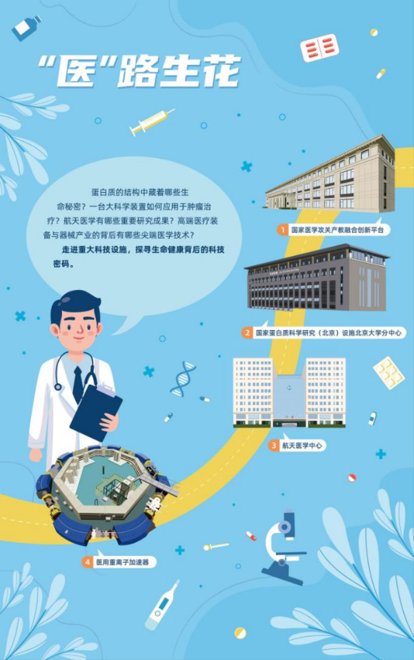 本期推出“‘醫’路生花”主題探索路線,帶你走進北京航空航天大學國家醫學攻關產教融合創新平臺、北京大學國家蛋白質科學研究(北京)設施北京大學分中心、中國通用技術(集團)控股有限責任公司航天醫學中心和中國科學院近代物理研究所醫用重離子加速器,感受守護人民生命健康的科技力量。