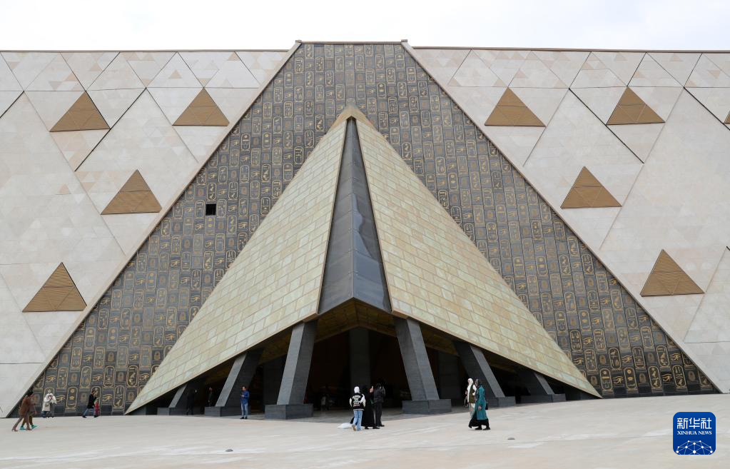 2月11日,游客在位于埃及吉薩省的大埃及博物館入口處參觀。