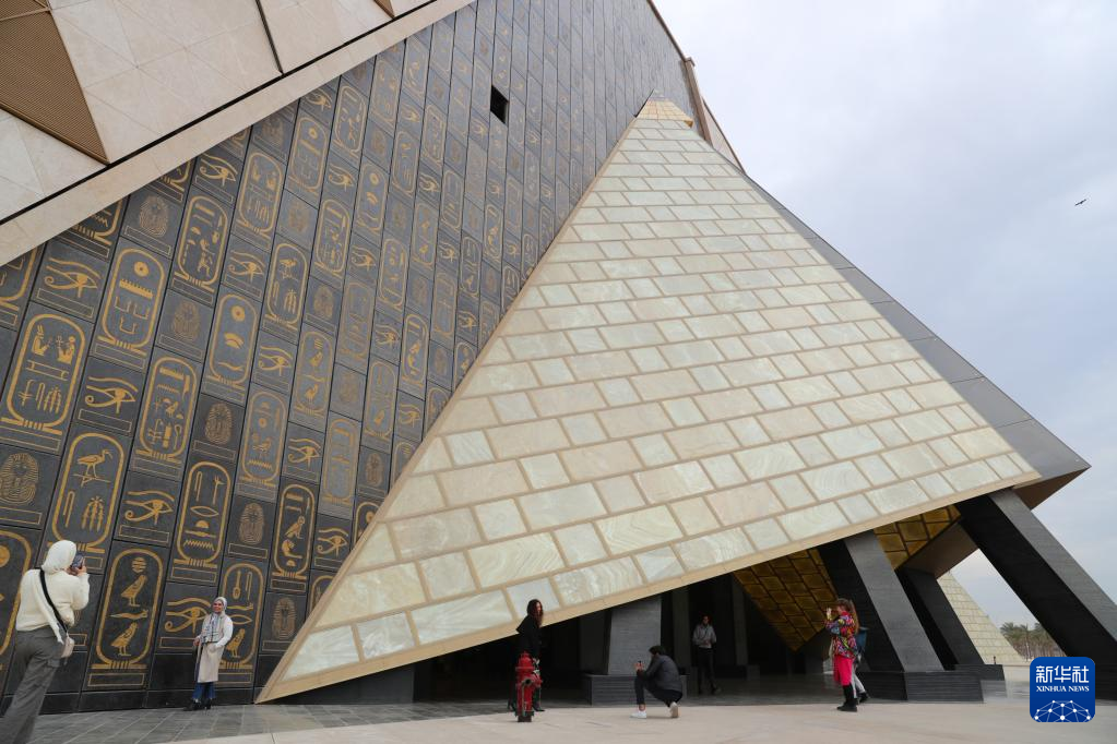 2月11日,游客在位于埃及吉薩省的大埃及博物館入口處拍照。
