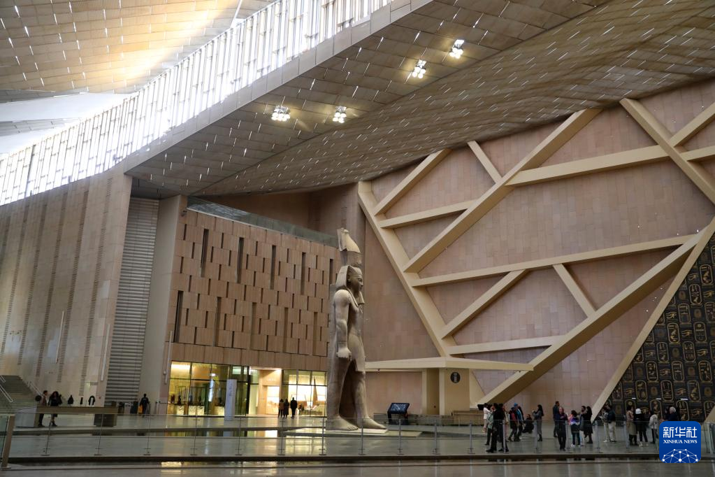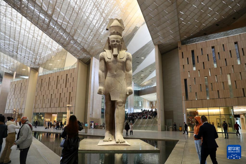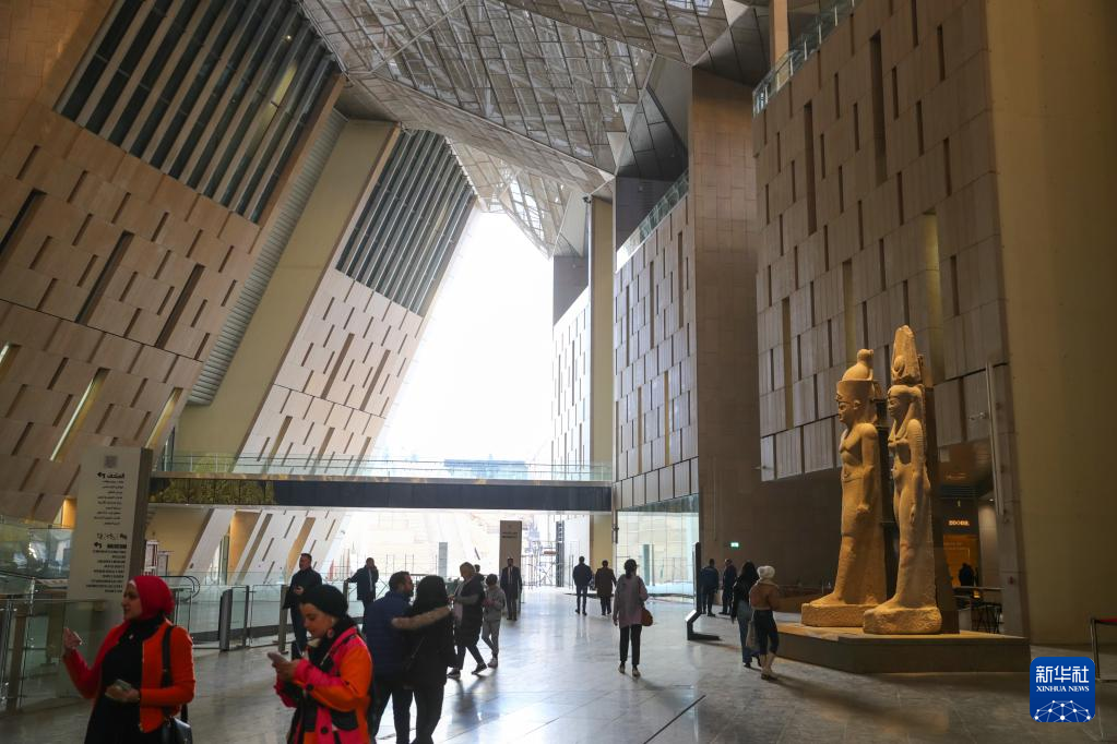 2月11日,游客在位于埃及吉薩省的大埃及博物館大廳已開放區域參觀。