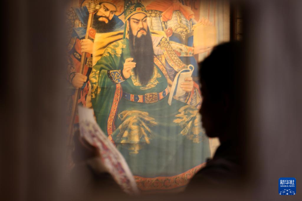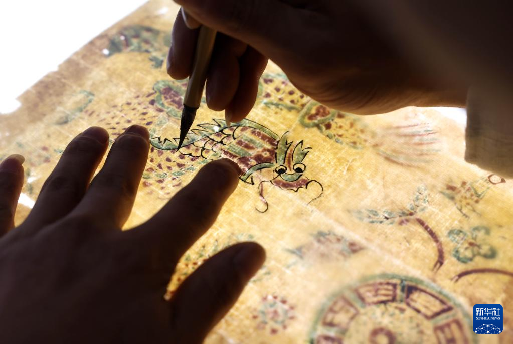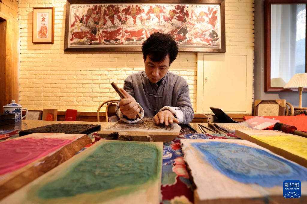 2月10日,在童壽記木版年畫工作室,童敏在研究年畫創作工藝。
