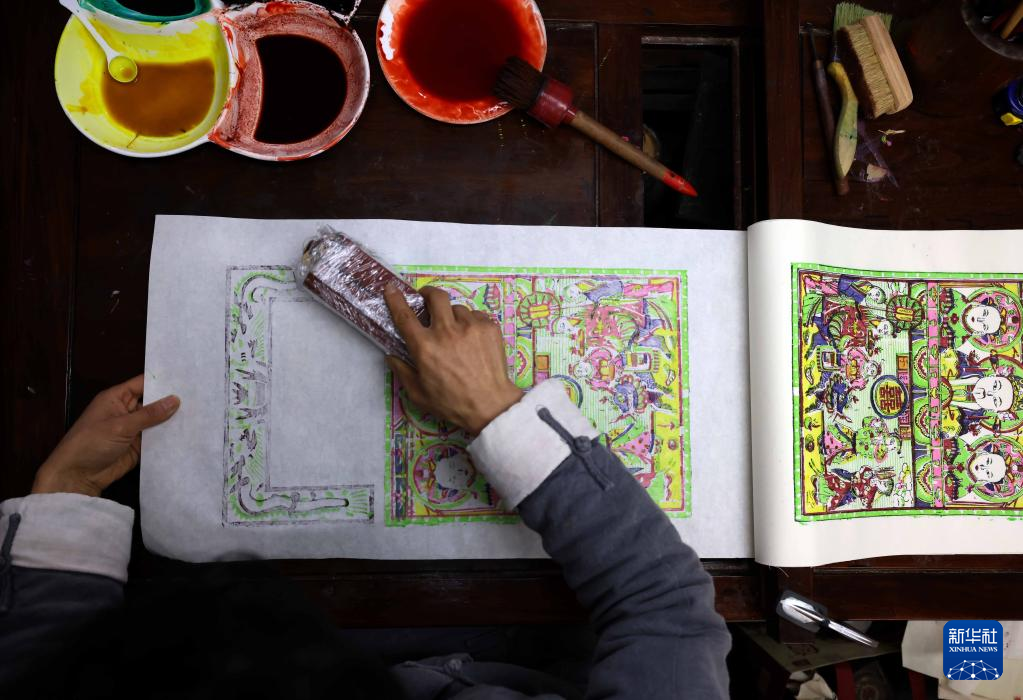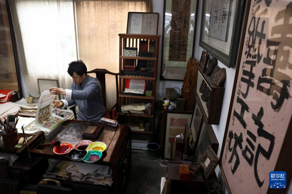 2月10日,在童壽記木版年畫工作室,童敏在印制年畫。