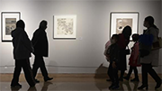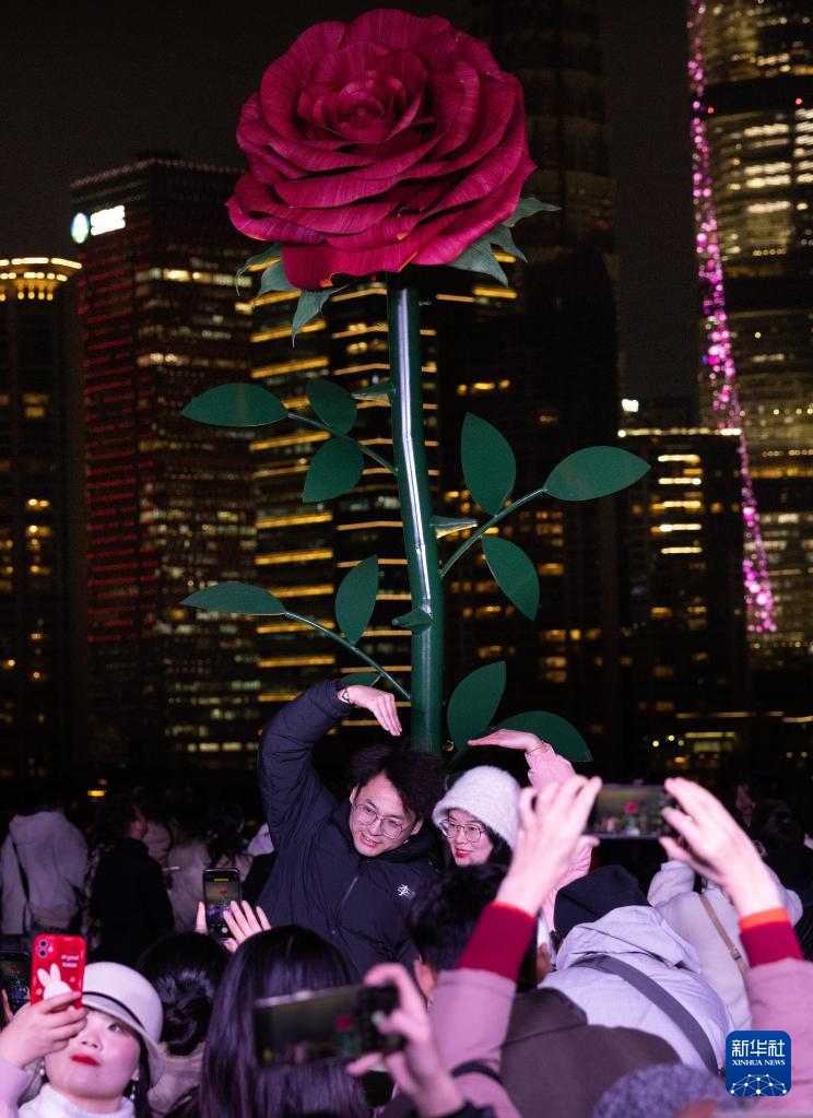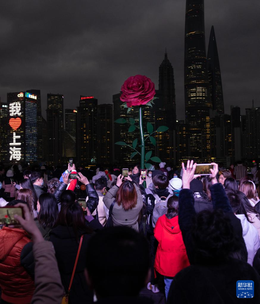 2月14日,市民和游客在高達6米的巨型玫瑰藝術裝置前拍照。