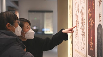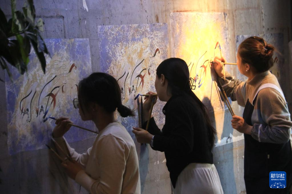 2月22日,在敦煌小鎮鳴沙書院,藝術工作者張杰龍(中)指導學員臨摹敦煌壁畫。