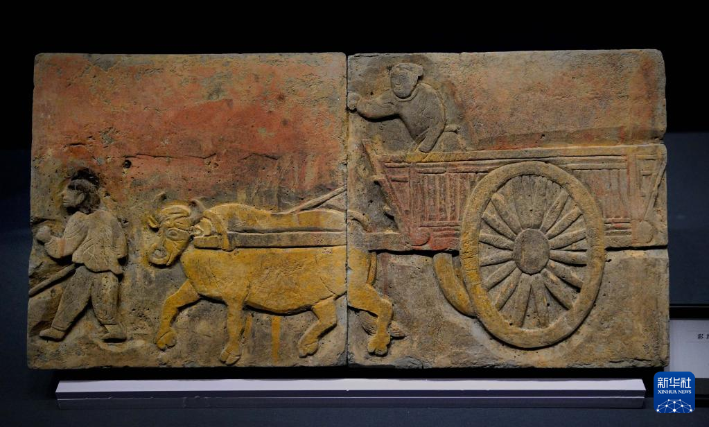 這是在鄭州大象陶瓷博物館舉行的“宋人生活與二十四孝磚雕展”上展出的彩繪牛拉車磚雕(3月1日攝)。