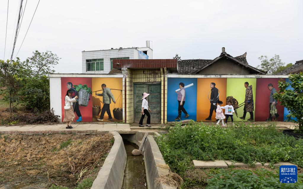 這是在寶勝村村屋墻壁上展出的影像藝術作品(4月1日攝,無人機照片)。