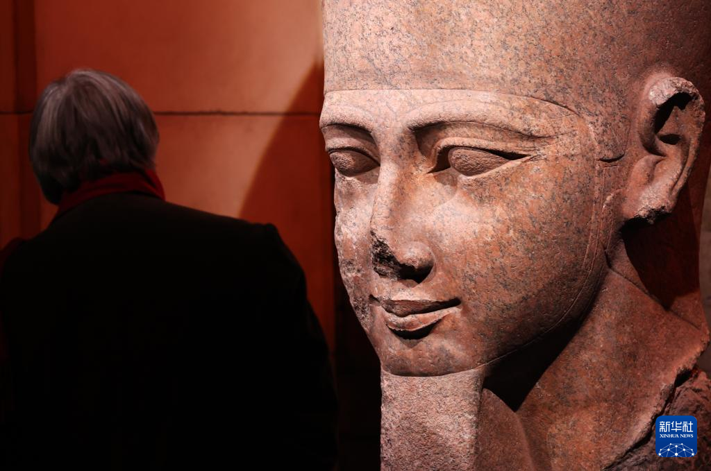 4月6日,媒體記者在法國巴黎參觀拉美西斯二世頭部雕像。