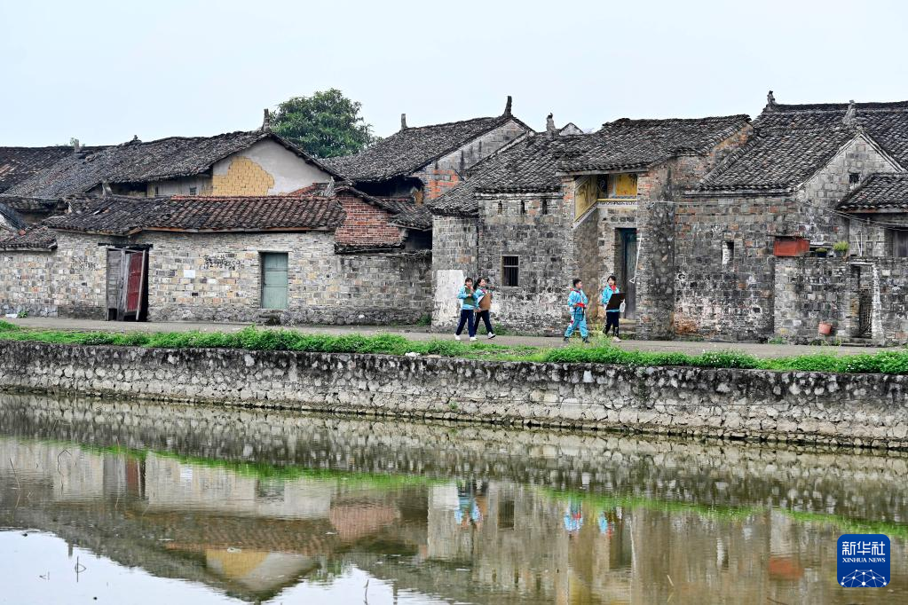 4月10日,在柳城縣古砦仫佬族鄉大戶村灘頭屯,幾名學生跟隨老師在民居旁寫生。