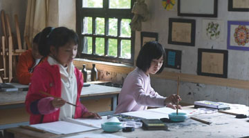 4月12日,諸暨市東白湖鎮斯民小學的學生在上國畫課。