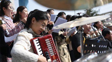 4月12日,諸暨市東白湖鎮斯民小學的學生在學習傳統武術舞劍。