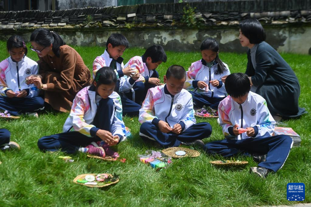 4月12日,諸暨市東白湖鎮斯民小學的學生在“尋找春天的色彩課程”中制作花草畫。