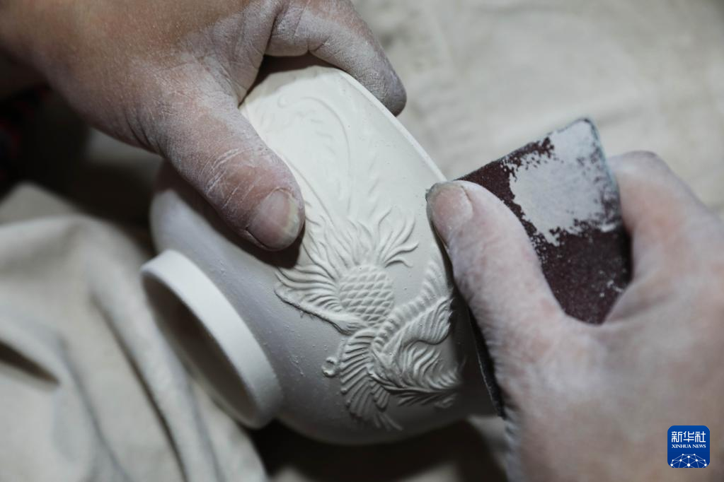 4月19日,在寶豐縣一家汝瓷企業生產車間,汝瓷藝人在打磨素坯。