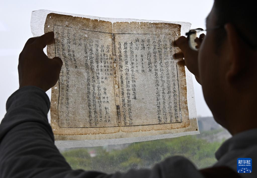 在山西省圖書館古籍修復中心,程文濤檢查古籍修復情況(4月21日攝)。