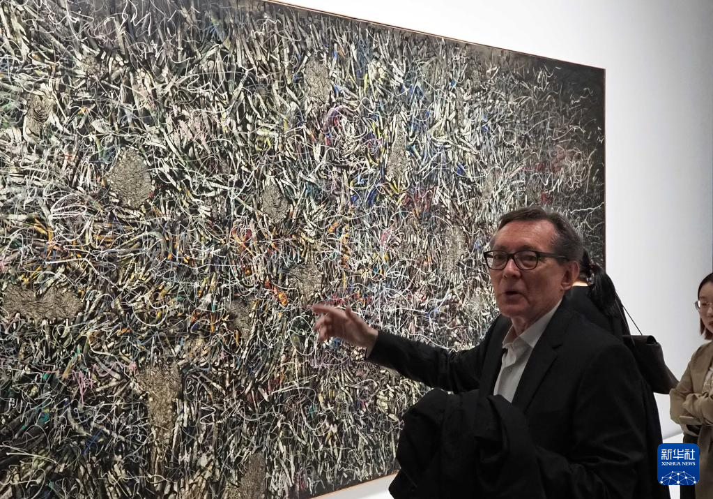 4月28日,策展人之一、法國國家現代藝術博物館副館長迪迪?!W廷格在展廳導覽匈牙利藝術家西蒙·韓泰的作品。