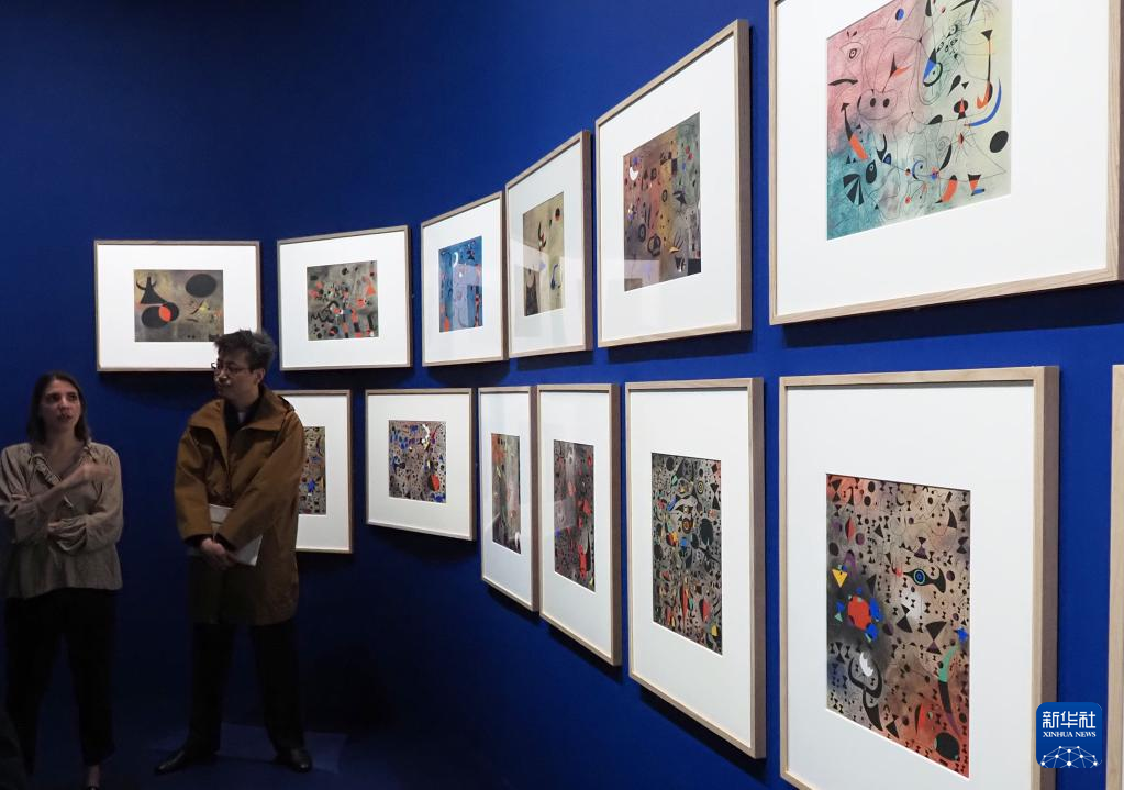 4月28日,策展人之一、法國國家現代藝術博物館現代收藏部瑪麗·薩雷(左一)在展廳導覽西班牙畫家胡安·米羅作品《星座》系列紙本水粉畫。