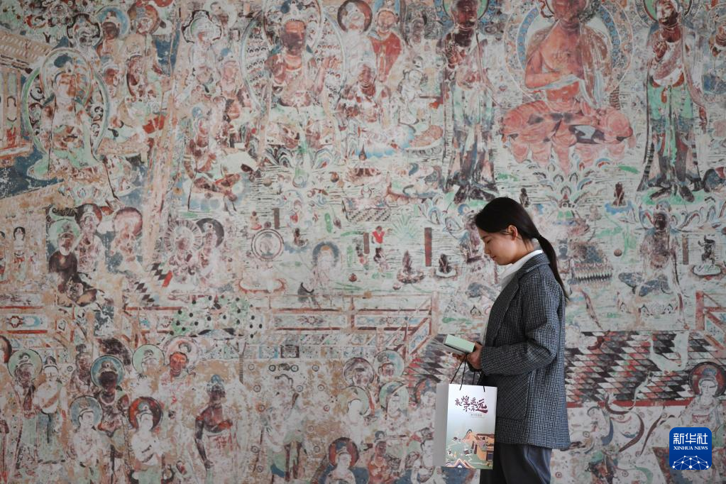 敦煌研究院文物數字化保護團隊創意營銷人員廖雪婷從一幅高保真復制壁畫前走過(4月25日攝)。