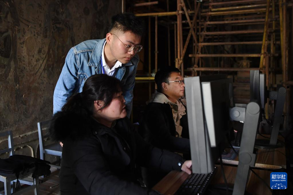 敦煌研究院文物數字化保護團隊圖像采集人員熊業騰(中)和同事在洞窟內查看剛剛采集到的圖片(4月25日攝)。