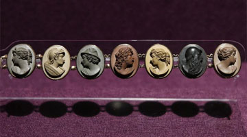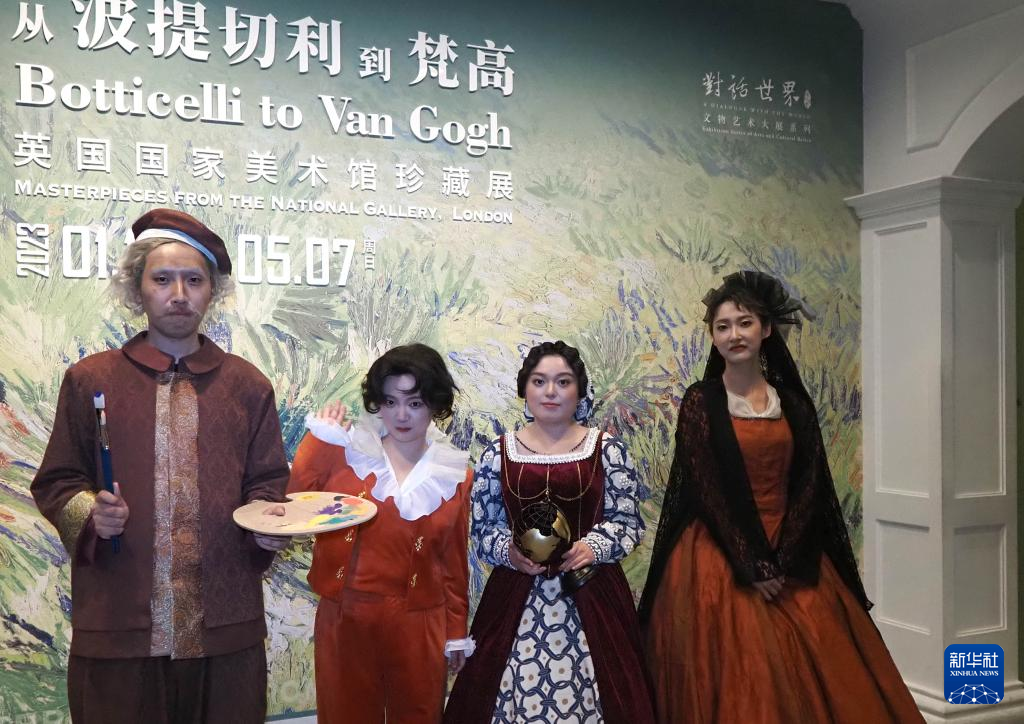 5月7日晚,上海博物館工作人員扮演英國國家美術館珍藏展作品中的人物形象在展廳入口歡迎觀眾。