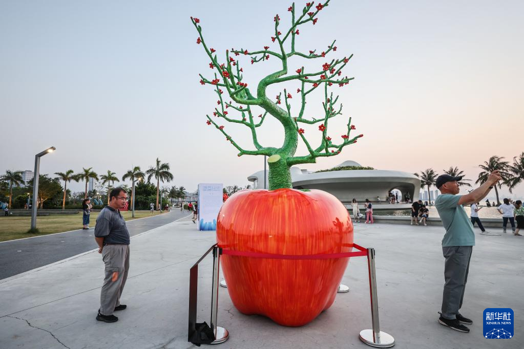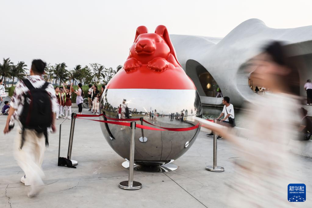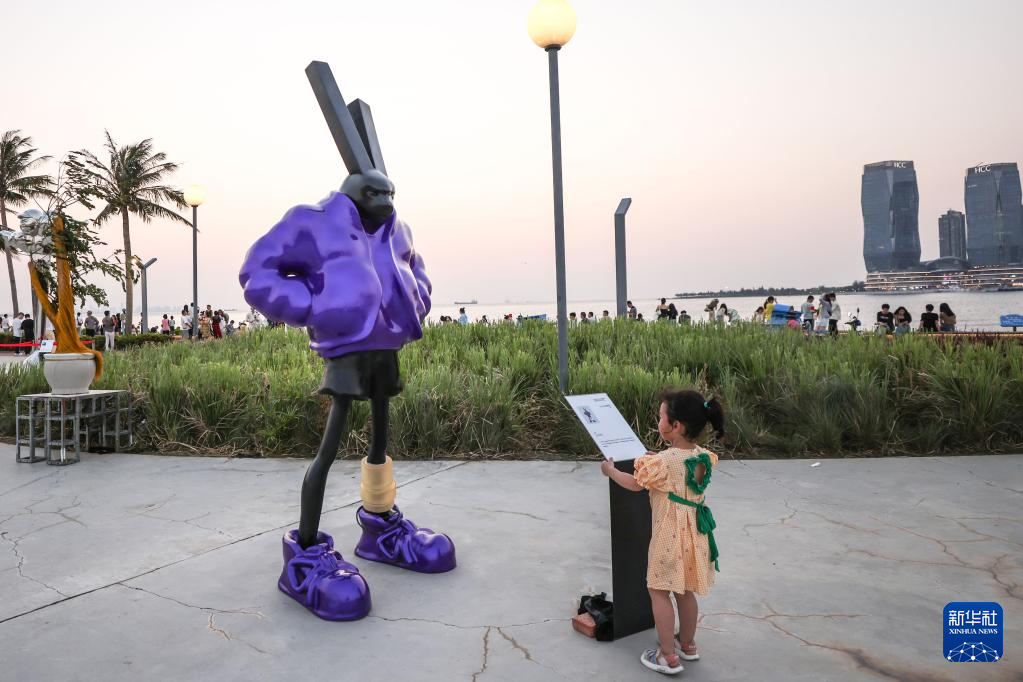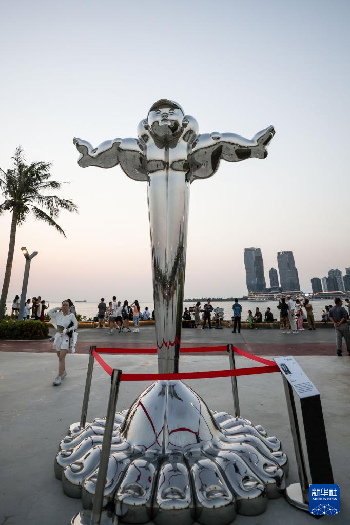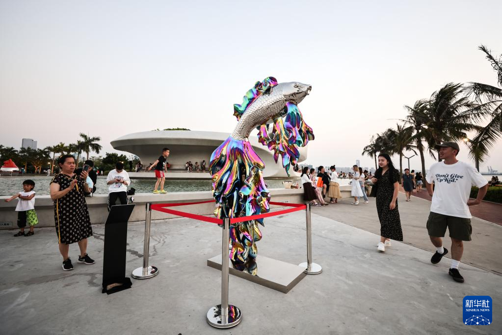5月6日,市民在??谠贫磮D書館外欣賞雕塑作品。