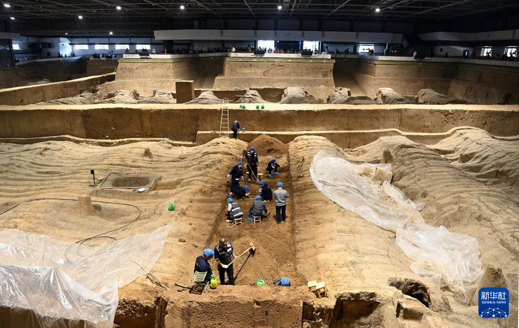 工作人員在秦兵馬俑二號坑遺址進行發掘工作(4月26日攝)。