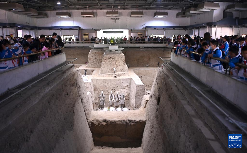 游客在秦兵馬俑三號坑遺址參觀(4月26日攝)。