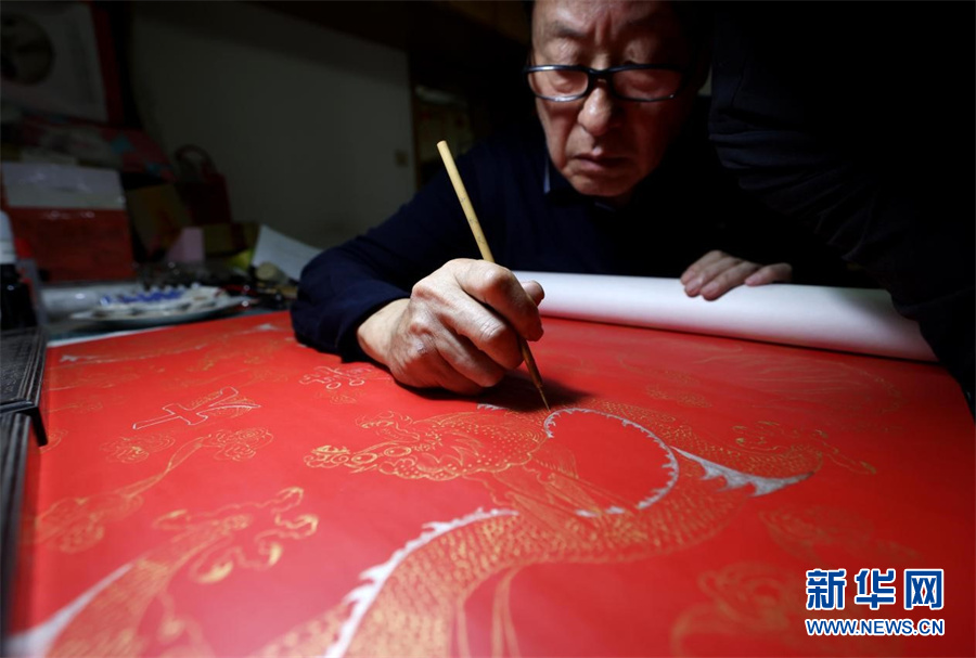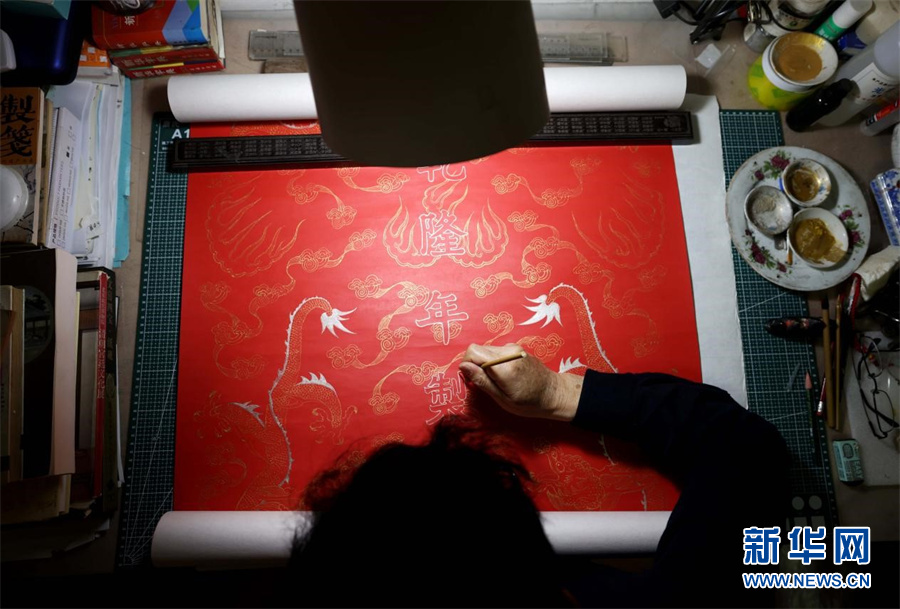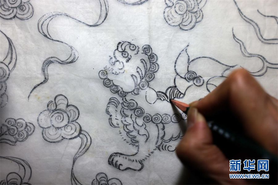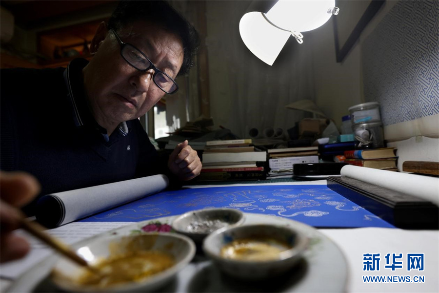 近日,宮廷描金紙省級非遺傳承人范發生在進行描金紙畫稿拷貝。