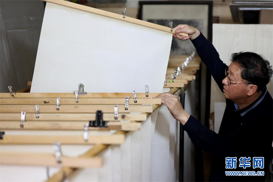 近日,宮廷描金紙省級非遺傳承人范發生在工作室進行紙張吊晾。