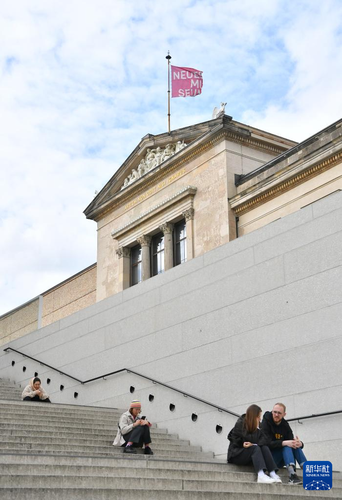 5月16日,在德國柏林博物館島,人們坐在新博物館旁的臺階上休息。