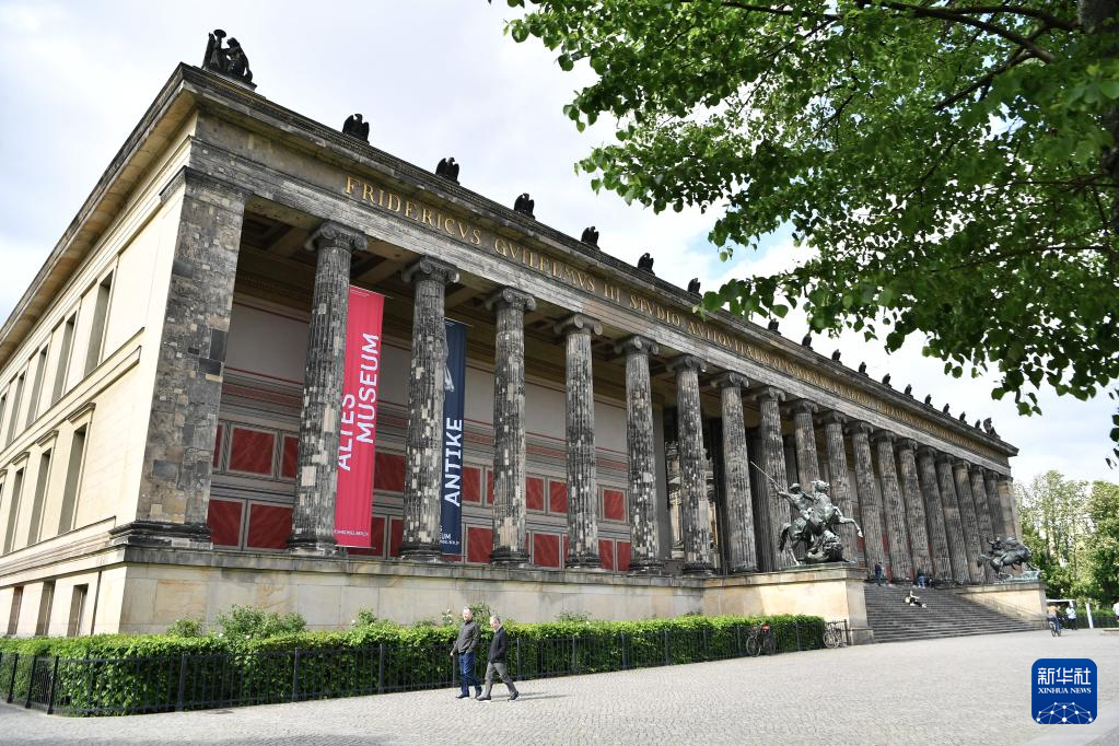 5月16日,在德國柏林博物館島,人們經過老國家美術館前的長廊。