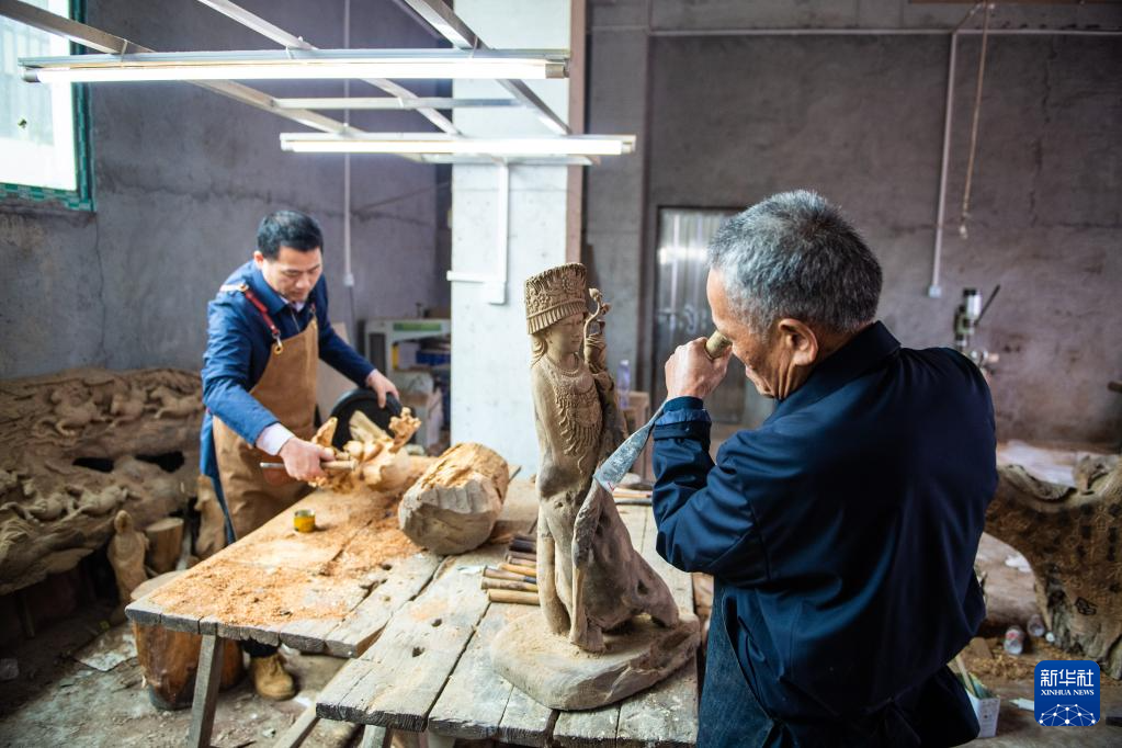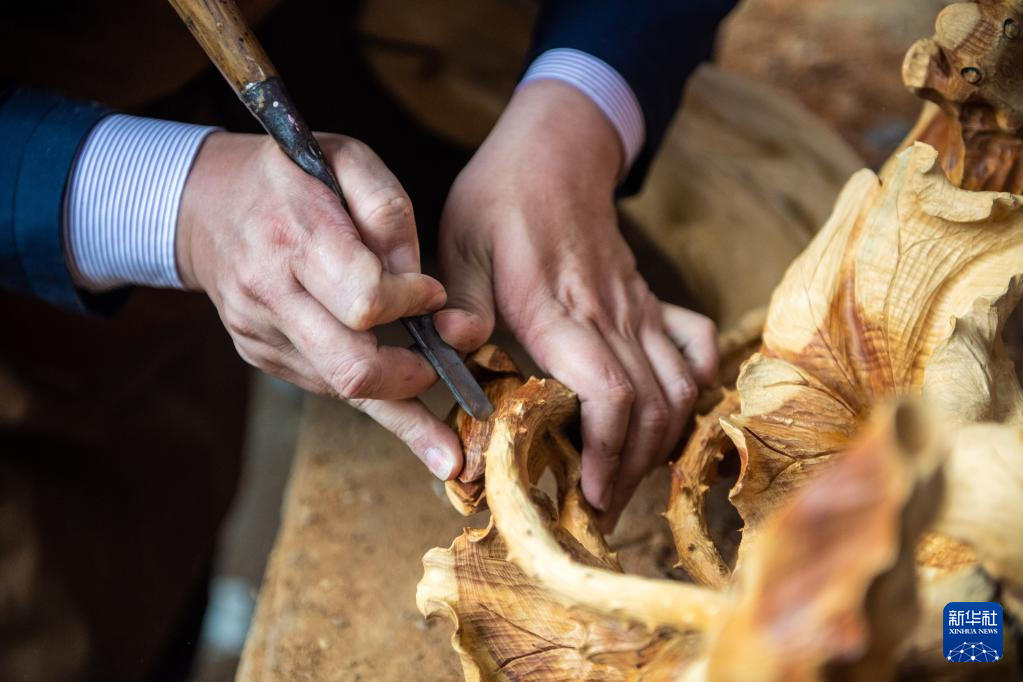 5月23日,在洞口縣巖山鎮陽家山村,洞口木雕非遺傳承人傅立先在創作木雕作品《絲綢之路》。