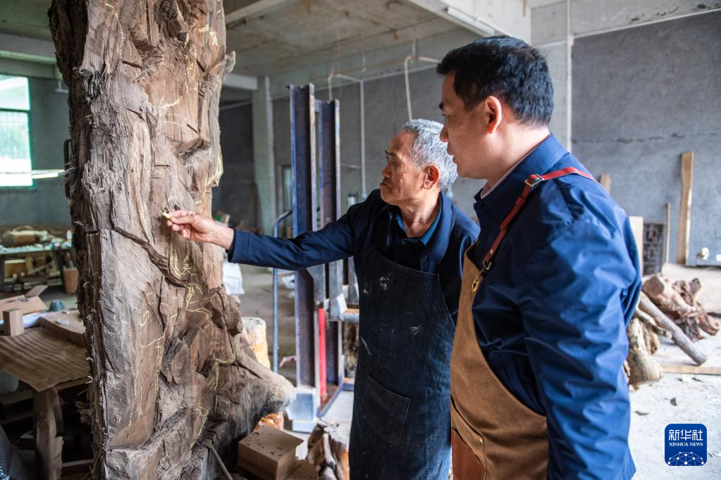 5月23日,在洞口縣巖山鎮陽家山村,洞口木雕非遺傳承人傅立先(左)和父親傅金林在創作木雕作品。