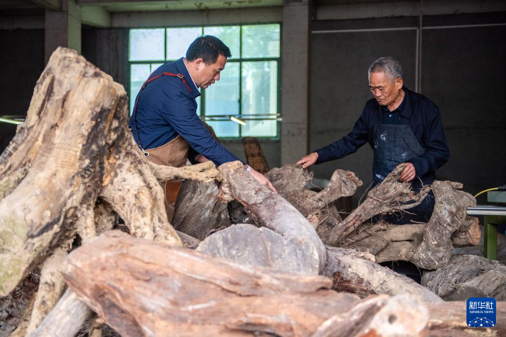 5月23日,在洞口縣巖山鎮陽家山村,傅立先(左)和父親傅金林在挑選木雕材料。