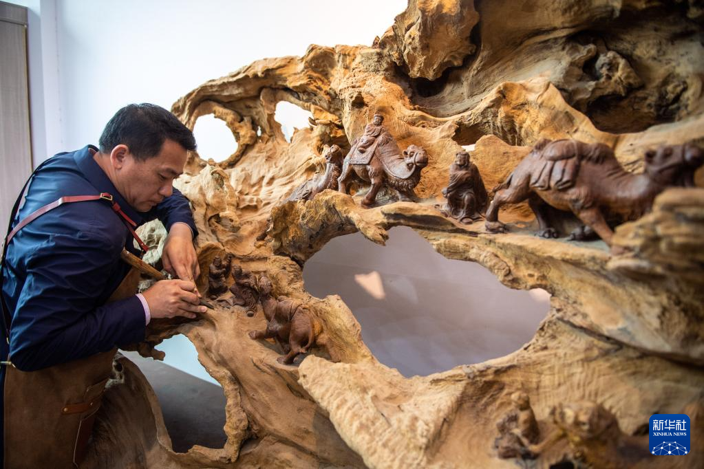 洞口木雕發祥于湖南省邵陽市洞口縣,歷史悠久,上個世紀80年代以來,洞口木雕產品遠銷海外。傅立先是洞口木雕非遺傳承人,他的爺爺傅滿山和父親傅金林曾是木雕工藝廠的老師傅。近年來,傅立先對洞口木雕的創作方向進行新的探索,把傳統工藝與現代文化相結合,創作出很多精美的木雕作品。