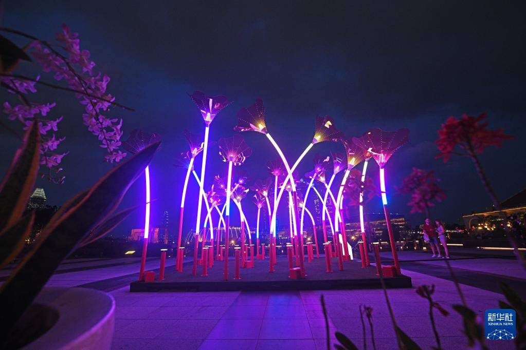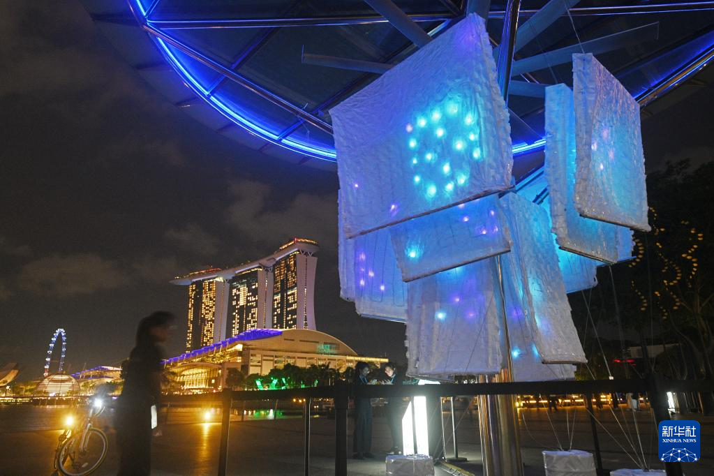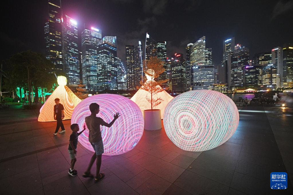 5月30日,市民在新加坡濱海灣觀看《照亮新加坡》燈光藝術裝置展。