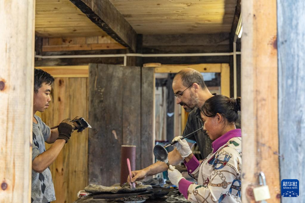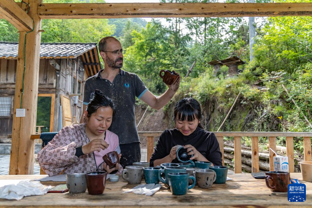 5月29日,在重慶市城口縣北屏鄉松柏村,文森·漆在工作室與當地村民給作品上漆。