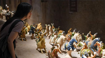 6月8日,一名身著傳統服飾的觀眾在文博會甘肅展臺觀看數字敦煌展覽。