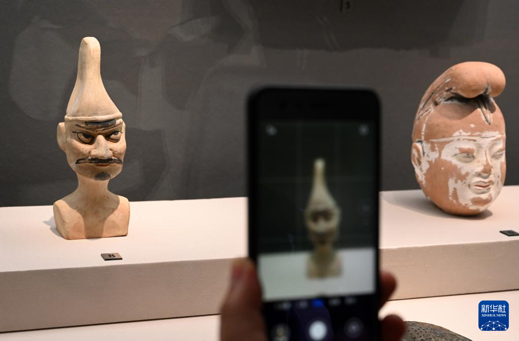 這是展出的彩繪泥塑頭俑(6月16日攝)。