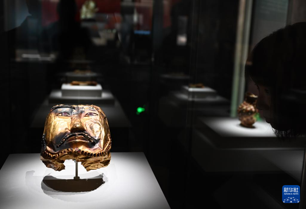 這是展出的鑲嵌紅寶石金面具(6月16日攝)。