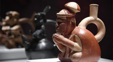 6月19日在特展上拍攝的浙江海鹽西塘橋采集的三足鳥形陶盉。