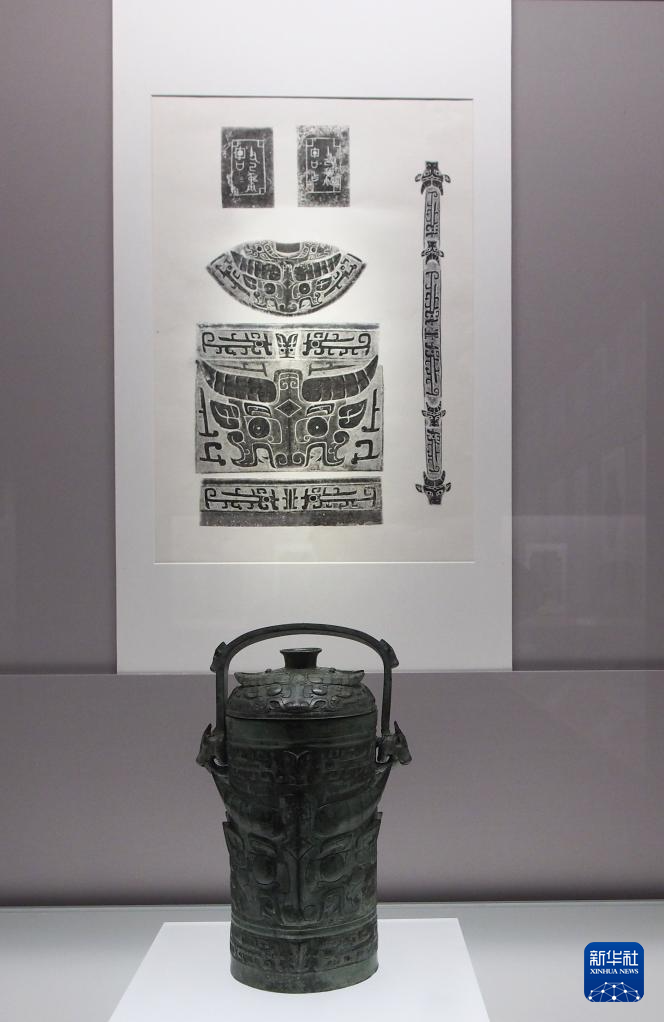 7月6日在上海博物館展廳拍攝的西周青銅器《古父己卣》及拓本。