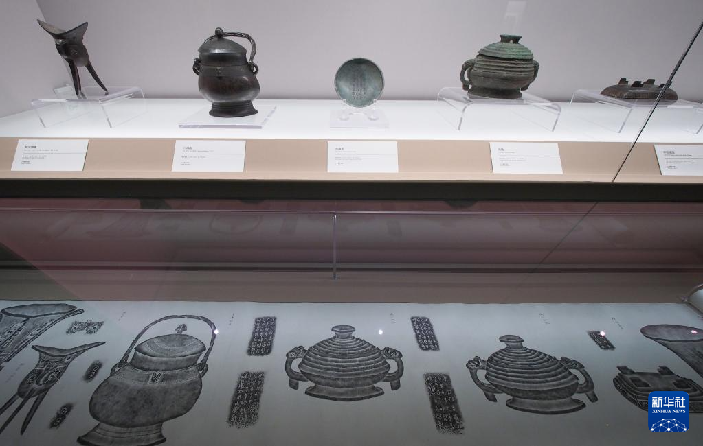 7月6日在上海博物館展廳拍攝的晚清金石學家吳大澂《愙齋集古圖》原器與墨拓對照(部分)。