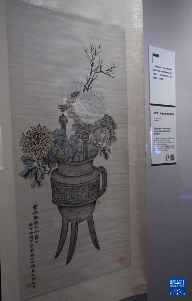 7月6日在上海博物館展廳拍攝的《杞菊延年圖軸》,系清代趙之謙、程守謙合作而成。