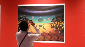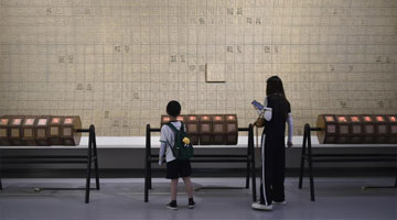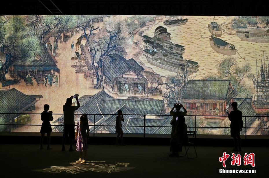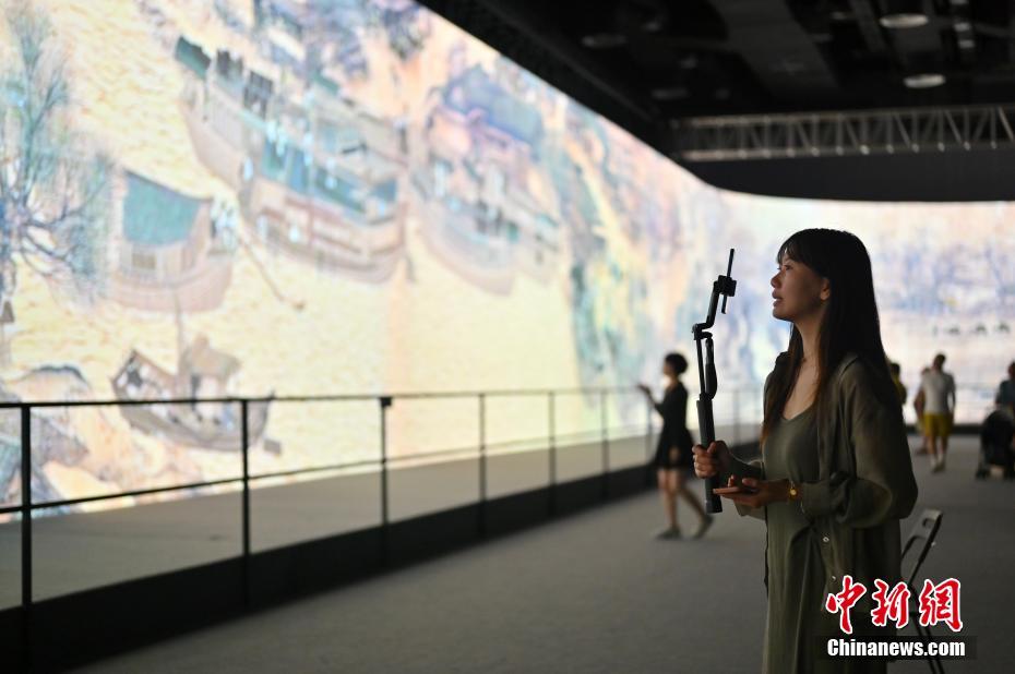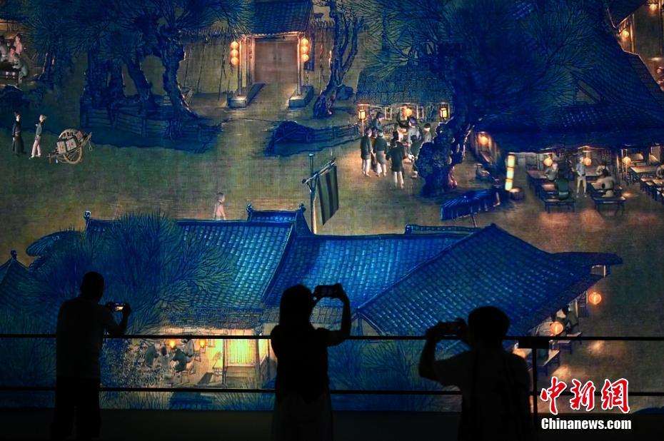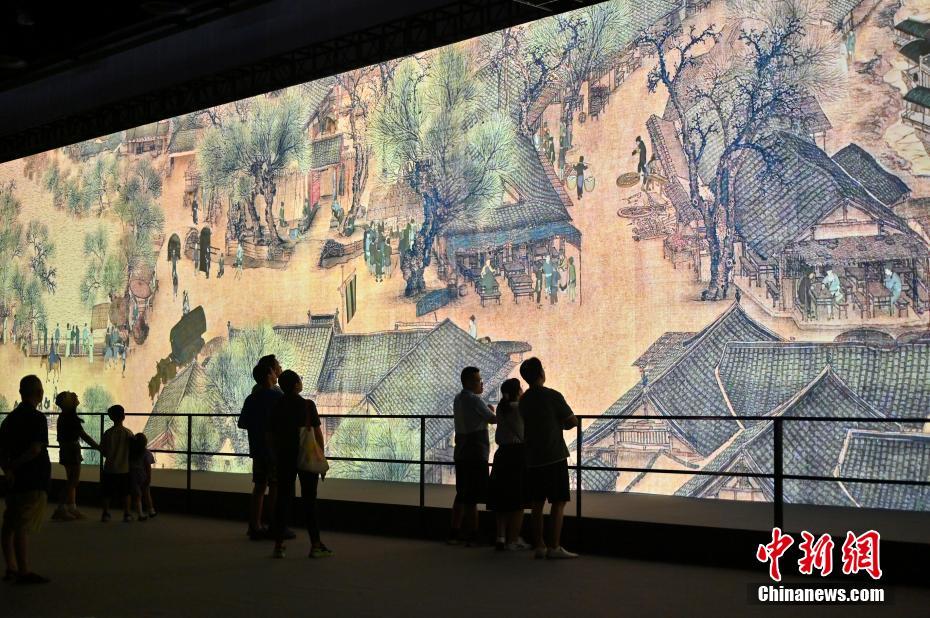 7月9日,廣西南寧,市民參觀在南寧國際會展中心展出的“會動的《清明上河圖》展覽”。此次展覽以北宋畫家張擇端所繪《清明上河圖》為藍本,通過巨幕熒屏將原作放大數百倍,復原上千個畫中人物,再現北宋時期的繁華盛景。