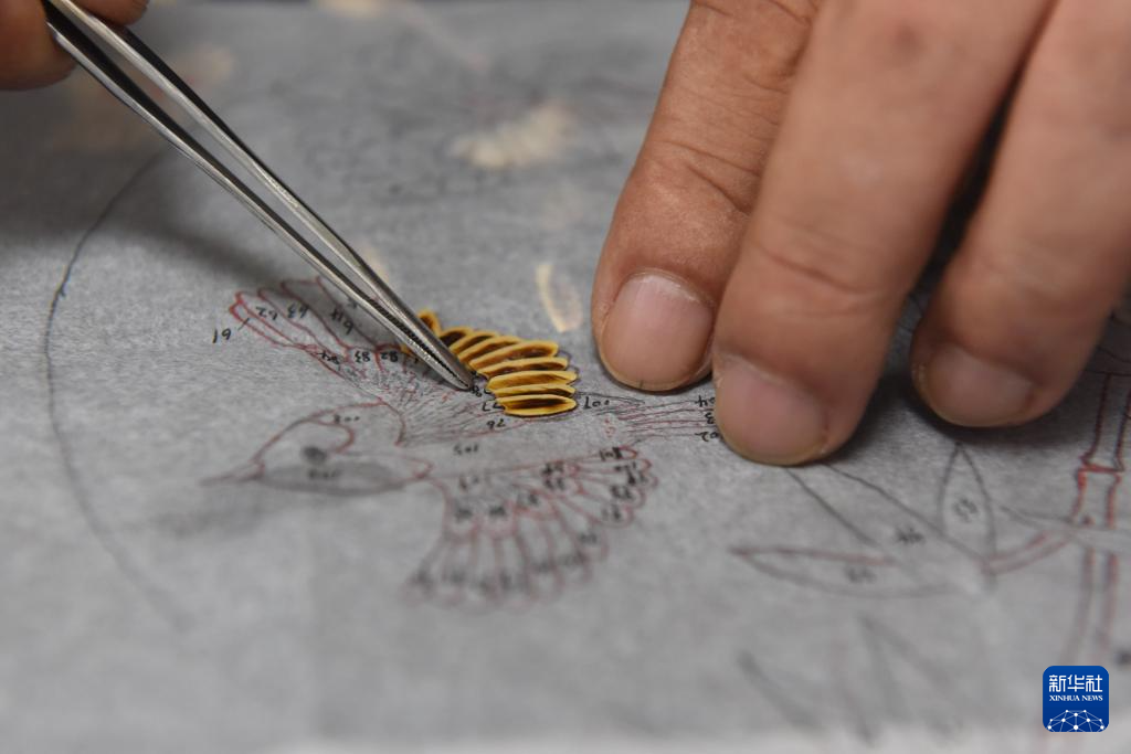 7月12日,吳永龍將拼好的一朵“花”放在底版上比對。