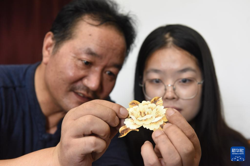 7月12日,吳永龍向學生展示麥稈畫的拼接方法。